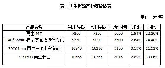本周再生PET市場(chǎng)繼續(xù)上行,價(jià)格刷新年內(nèi)高點(diǎn)。截至收盤(pán),華東市場(chǎng)仿大化白片未含增值稅價(jià)格在7400元/噸,較上周上漲100元/噸,漲幅在1.36%。