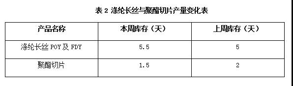 本周,滌綸長(zhǎng)絲POY及FDY與聚酯切片的庫(kù)存分別為5.5和1.5天。滌綸長(zhǎng)絲本周庫(kù)存較上周上漲0.5天,聚酯切片庫(kù)存較上周下滑0.5天。