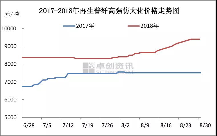 本周再生普纖主流市場(chǎng)行情繼續(xù)上漲,局部地區(qū)價(jià)格也有上調(diào)。截至周四江浙市場(chǎng)再生普纖高強(qiáng)仿大化含稅價(jià)格在9200-9600元/噸,較上周漲200元/噸。