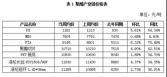 本周,卓創(chuàng)監(jiān)測(cè)的聚酯產(chǎn)品及原料板塊中產(chǎn)品全部上漲。漲幅第一位的是PTA,環(huán)比上漲6.32%,本周因PTA現(xiàn)貨維持高升水結(jié)構(gòu),在補(bǔ)升水行情推動(dòng)下PTA期貨延續(xù)漲勢(shì)。