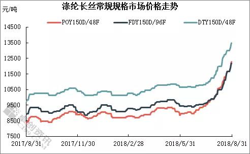 滌綸長(zhǎng)絲市場(chǎng)行情連續(xù)10周上漲。截至本周四,常規(guī)品種POY150D/48F、DTY150D/48F、FDY150D/96F周均價(jià)分別為11965元/噸、13240元/噸、11930元/噸,較上一報(bào)告周期環(huán)比上漲4.04%、2.72%、4.37%。